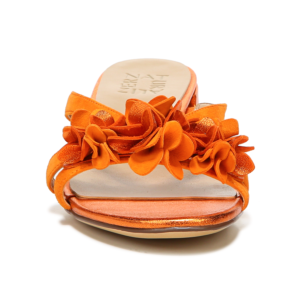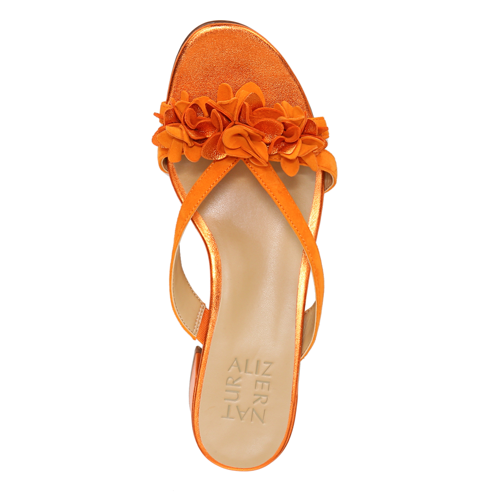 • Dressy slide sandal with floral details.